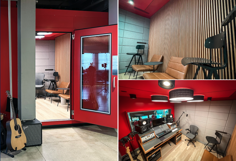 IAC Acoustics Accutone2 Studio was chosen for its proven performance, modularity and flexibility. Specced out at a Noise Isolation Class (NIC) of 53, the space ensures that the artists do not disturb workers in the office space and vice versa. Of note are the internally sloped glass window and STC-51 Noise-Lock® Door, two ways in which the room is made to feel more open. In addition to being clear on his desired acoustic needs, Roadcap had strong opinions on aesthetic finishes, all of which Dutton was able to deliver on. Tapping into the offerings of Sound Seal, fellow member company of Catalyst Acoustics Group, one interior wall was covered in sleek acoustical wall panels while another was faced in a dramatic WoodTrends acoustical wood wall product. The exterior of the studio was powder-coated in BMG red, to ensure that the space is as visually appealing as it is acoustically effective.
